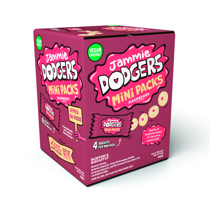 Jammie Dodgers are delicious shortcake biscuits, sandwiches filled with sticky raspberry jam. Each packet has 4 mini biscuits per pack. Vegan friendly.