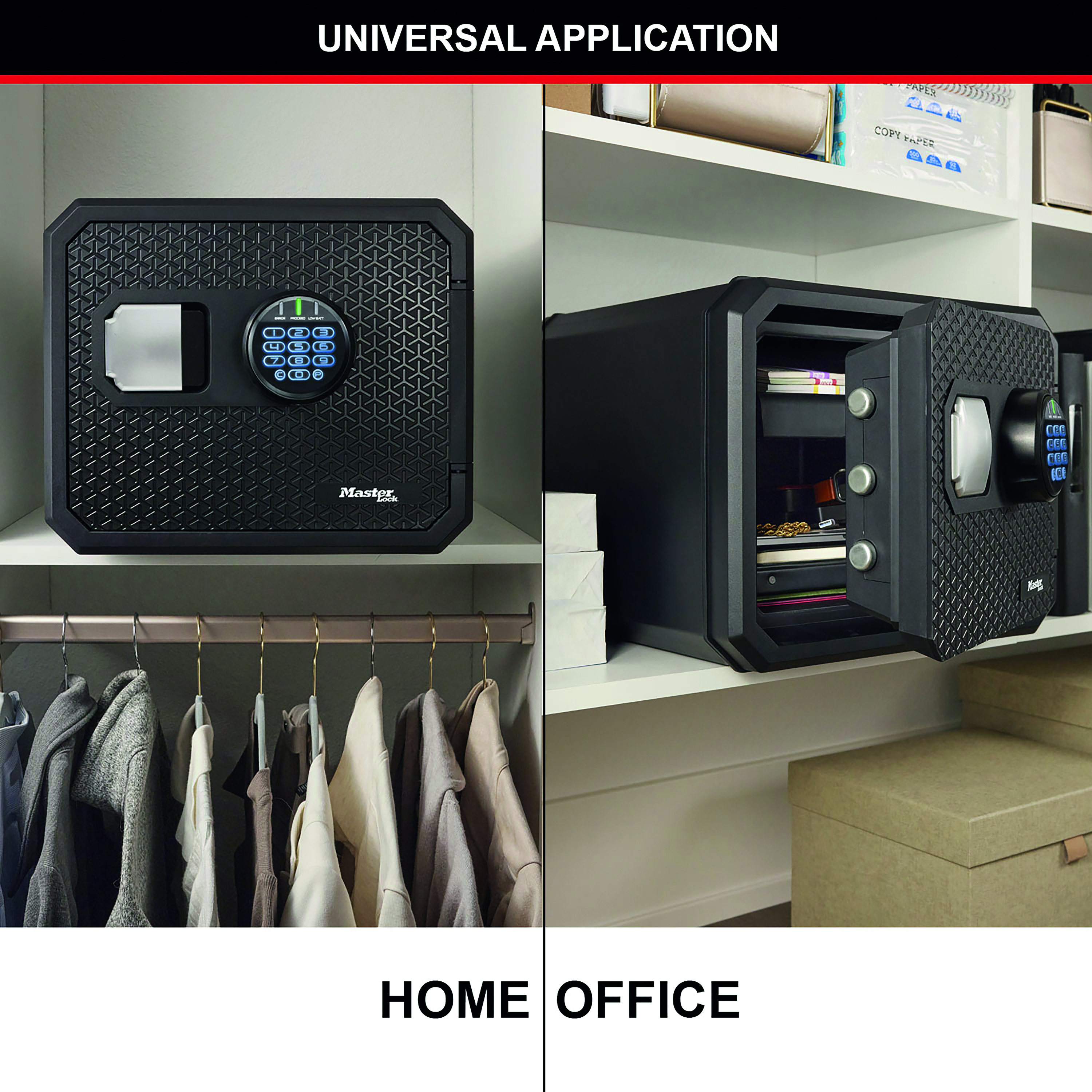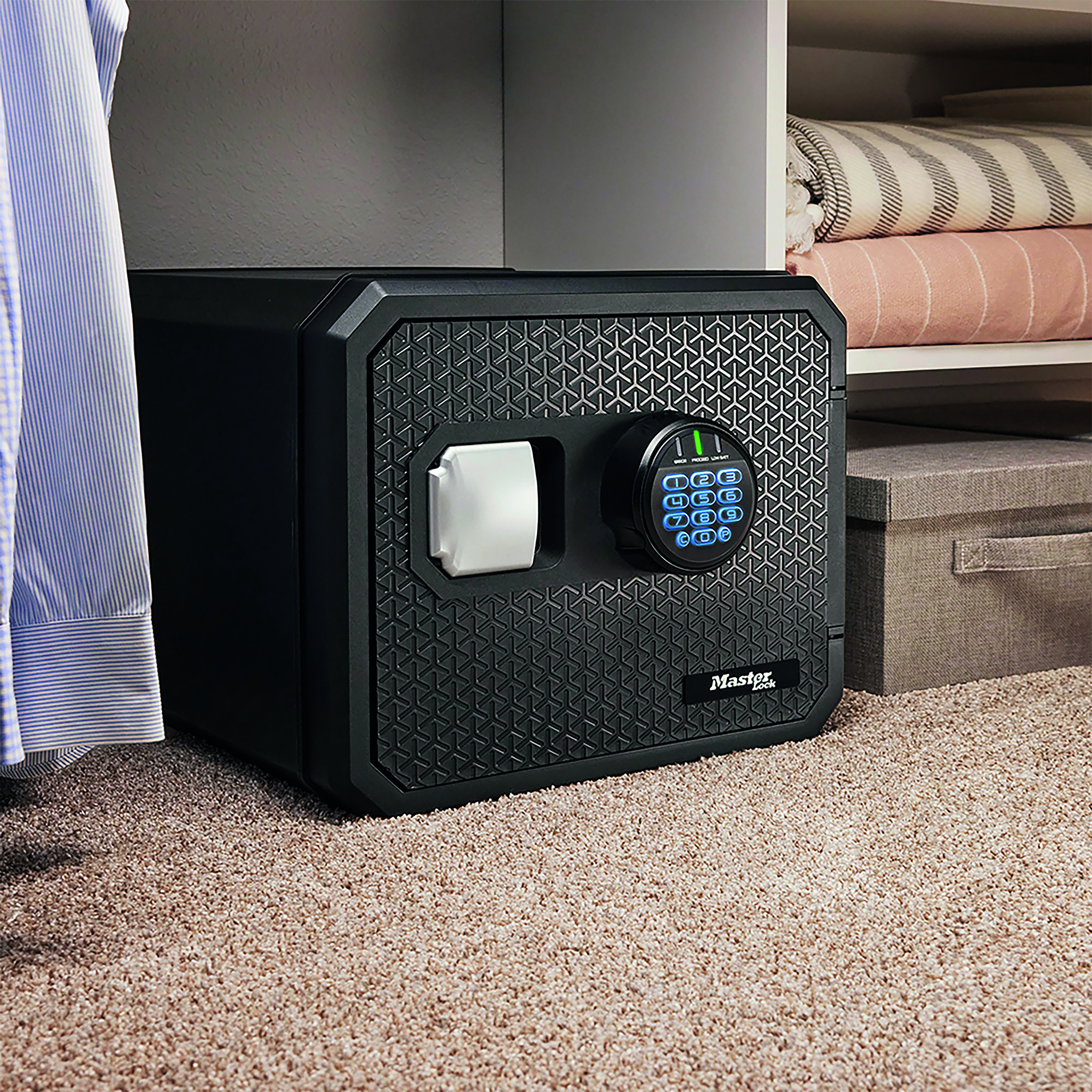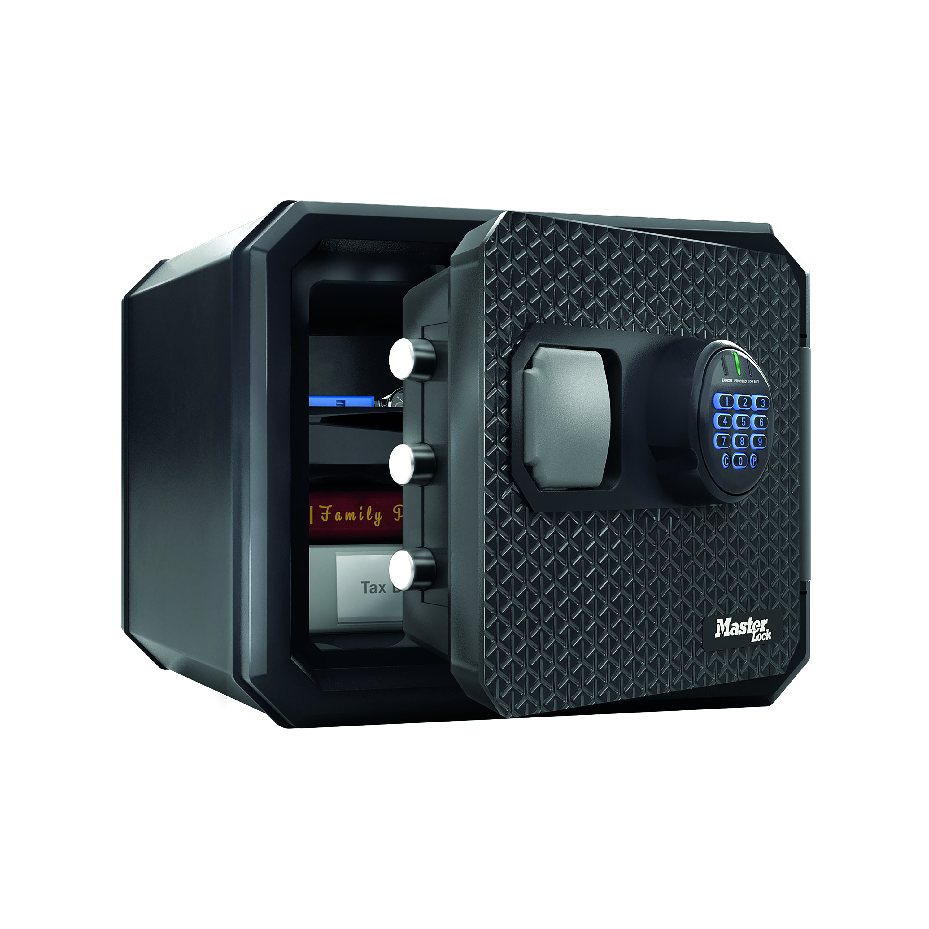 The Master Lock FPW082FTCML Next Generation Fire Safe is the first of its kind to leverage 'Master Lock Security, Built In' technology. Its advanced, multi-point protection system effectively resists physical attacks and lock manipulation. Ideal for protecting documents and irreplaceable valuables. It has a sleek, modern design; textured herringbone exterior, angled corners and an integrated metal handle offers secure yet simple access. Powered by Lithium batteries, these batteries are pre installed and provide extended battery life.